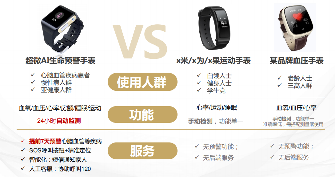 其实,市面上也有不少智能穿戴设备打着监测心率/血压/血氧数据的旗号,实际上没有核心技术做支撑,因此常会出现监测数据精确度不高的问题。超微AI生命预警手表则不同,对心率/血压/血氧数据准确率达90%,是行业领先的医疗级高精度水平!加上,外观高贵的极简设计,操作简单,老人也能够轻易上手,不管是作为家用,还是商务,集心率、血压、血氧监测,房颤侦测、睡眠检测、一键测量、运动计步、SOS求救、精准定位、时间、日历、天气等12项功能于一身的超微AI生命预警手表都hold得住。