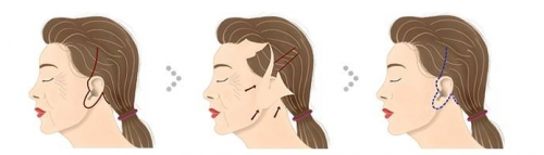 而慢慢我们迎来得第二代技术,就是以颞部(脸部上方、头部2边头骨软组织,特指我们日常生活中俗称的太阳穴部位)、发际线小切口的“小拉皮”。