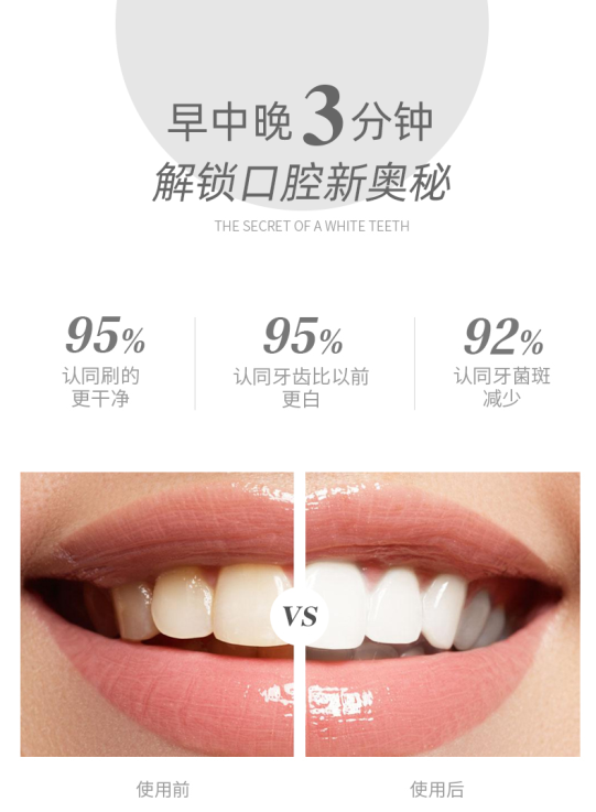 清新口气,平衡口腔菌群,一场关于口腔抑菌的战役已经打响。倍加洁益生菌牙膏主要添加益生菌AP-32,健康天然无副作用,通过抗衡有害菌,能有效美白牙齿、去除牙菌斑、清新口气,特别是对于蛀牙、牙周病等有预防作用。全部原料采用经口腔行业协会指定的安全成分,不添加苯甲酸钠,二甘醇,化学杀菌剂,化学漂白剂以及各种对人体有害成分。