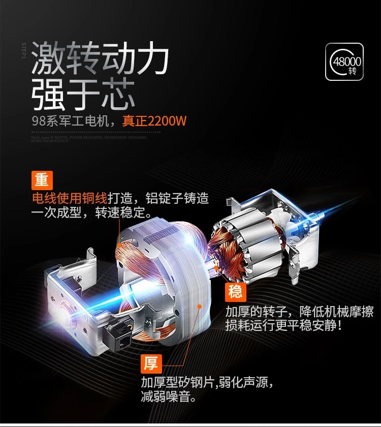 国内超过99%的破壁机的转速都在1-3万转之间,根本达不到真正的破壁效果,而米哥自主品牌的龙凤京贡破壁机,采取98系军工电机,真正2200w,是国内屈指可数的转速达到每分钟48000转的破壁神器。