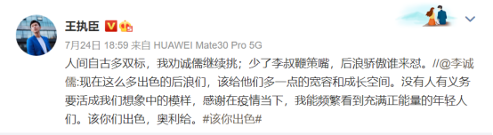 作为一名后浪,为年轻人发声也是理所应当,王执臣此举显然是还没有忘记之前李老师对小鲜肉没有演技的讽刺,但李老师当日的那番言论也确实事出有因,对事不对人,有则改之,无则加冕,大可不必一一对应。