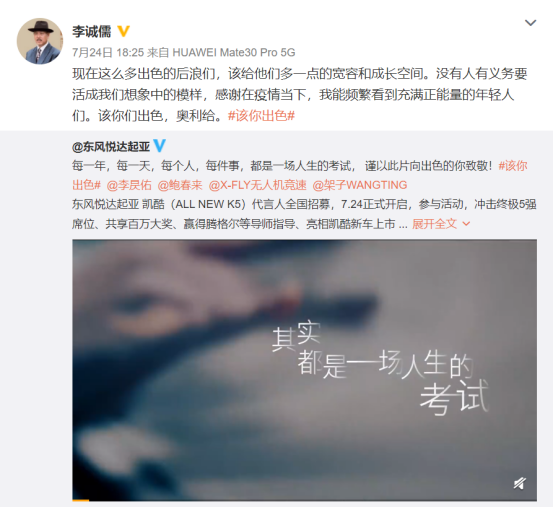 然而近日,李诚儒却摒弃了一贯的严厉与犀利,展露了少见的温情,对着年轻人大力赞扬。仅仅因为悦达起亚旗下的凯酷轿车全国有奖寻找代言人的宣传片“该你出色”的主题,与他近来对年轻人的认知不谋而合,他老人家二话不说,转发并评论了微博,承认了自己以前的偏颇,丝毫没有端着掖着。