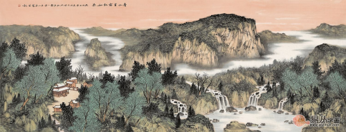 王宁老师的这幅山水画作品 《春晖》,整幅作品工写俱佳,画面中云雾缓缓升腾,两岸峭壁参差,草木拂动,春树花朵盛开,倍显生机,仿佛仙境一般,静静欣赏,余韵清远,云雾缭绕,风景如画,令人流连忘返。山脚下的几处屋宅,古香古色,依山而建,靠水而居,令人羡慕不已,彰显神秘意境。整幅画面动静结合,色彩巧妙搭配,真实再现了自然宁静的山中美景,隐秘屋宅完美地展出人与自然和谐共生的场景,意境十足,是一幅不可多得的客厅山水画佳作。