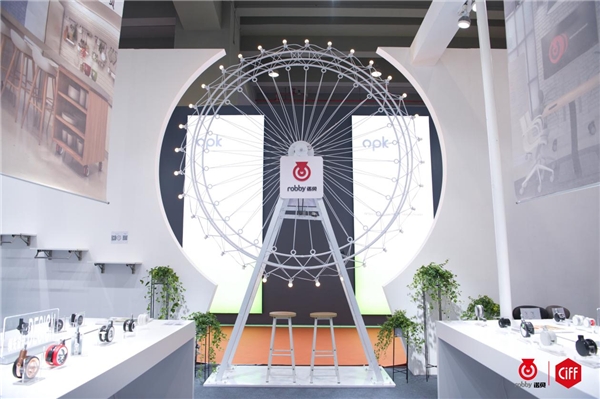 家博会开展首日,位于S15.3 C02展位的诺贝展馆便迎来了热情满满的群众驻足参观。如此高涨的人气,还要归功于此次展位别出心裁的设计。一到诺贝展馆便可看到一个白色摩天轮,吸引不少游客驻足拍照,不停转动的摩天轮,也诠释了诺贝脚轮的“尽享转动乐趣”的概念。