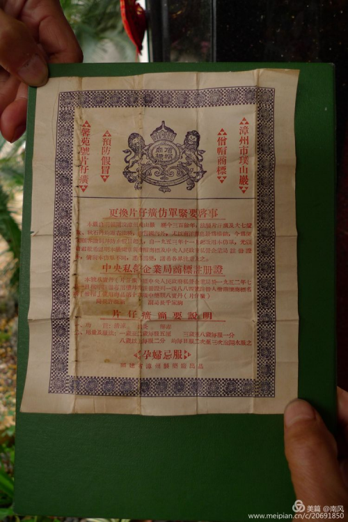 说明书的内容分上下两部分,上方正中是双狮托着的僧帽商标图案,左右竖印四列,内容是:“漳州市璞山岩,馨苑片仔癀,僧帽商标,预防假冒。”下方印有启事、注册证内容、服用说明等四栏。第一栏是“更换片仔癀仿单紧要启事”,内容有“本岩自明朝开设漳州璞山岩,历今三百余年,法制片仔癀及七厘散、秋石丹,均遵古法制,销售国内外,尤以南洋群岛最为畅销,今为便利顾客识别并防止假冒起见,自一九五三年十一月起改用本仿单,光顾诸君敬希认明本岩图章与僧帽商标及中央人民政府私营企业局注册证外,倘与本仿单不同,悉为伪药,诸希各界注意及之。”第二栏是“中央私营企业商标注册证”,内容是“本号八宝丹(片仔癀),经中央人民政府私营企业局于一九五二年七月一日核准,注册专用权并发注册证,列一四八八四号,注册人僧鼎怀商标,名称“僧帽”,使用商品第十六项中药类八宝丹(片仔癀)。局长:许涤新,副局长:千家驹。第三栏是“片仔癀简要说明”,内容有功能,用量及服法等。第四栏注明:“孕妇忌服”字样。底下是“福建省漳州制药厂出品”。从这盒片仔癀其包装和盒内片仔癀的形状可以看出当年片仔癀的生产就已具有强烈的品牌意识和防伪功能。