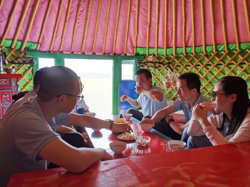 到了傍晚时分,大家抵达蒙古汗城景区,享用牧民家蒙餐风味餐。店家很热情的招待,里面很多蒙古食物都是大家第一次见与品尝,特别是奶类品、烤全羊、羊血肠和沙葱等。