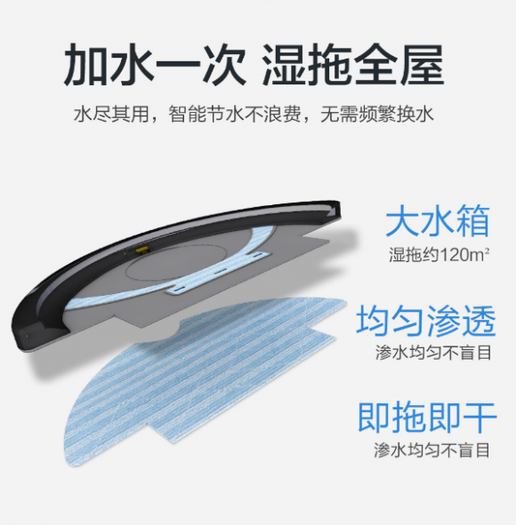 所使用的水尽其用不浪费的大水箱,能均匀渗水至细纤维抹布上深入地面进行湿拖,让地面环境一层不染。大水箱的使用也比较便利,只需加水一次便可湿拖大约120㎡的房屋,不必频繁加水更能加快清洁进度。