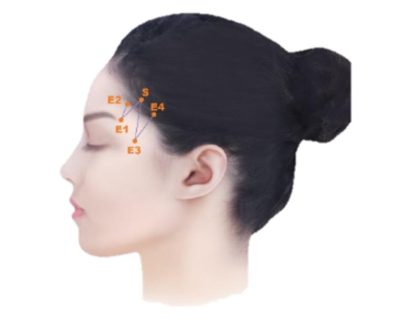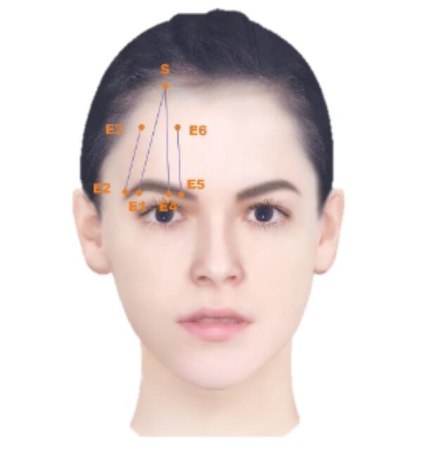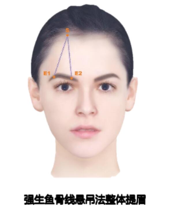 分享到利用鱼骨线和螺旋线的悬吊法来达到整体提眉和眉尾颞部提升的效果,在鱼骨线布线点的选择上以图中的S点为眉峰垂直线与发际边缘交点(根据眉形需要调整具体进针位置),E1点为眉尾处(眉峰备选),E2点为眉头处。