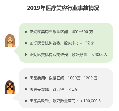 根据报告,黑医美用户数量在1000万人至1200万人之间,也就是说大约每100多位用户中就有一个受害者,事故率接近1%。作为对比,正规医美机构的致残、致死率不到千分之一。