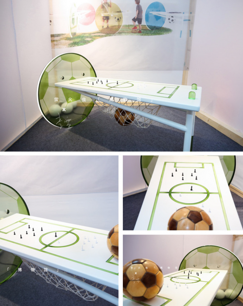 “绿茵草场”作为一款全年龄向的“运动主题”书桌,可根据不同年龄段孩子的身体发育,进行桌面高低调节。设计解构了绿茵足球场,提取了足球、门框、球场三个元素与书桌功能、框架相互融合,脑洞大开的将足球场缩小至桌面比例,足球放大至6倍取其切面,成为了支撑桌面的结构之一,桌脚与可存放物品的挂网形成了新的“门框”。在“绿茵草场”书桌前学习之时,就如在球场上叱咤人生。