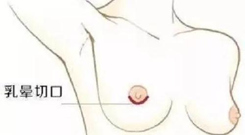 切口位置在乳晕深色皮肤与浅色皮肤交界处,或者横跨乳头,或者越过乳头边缘。选择这个部位做切口时,医生在乳晕边缘(多位乳晕下方)做一弧度长为3-5cm切口。如果乳晕偏小,医生可能会在乳晕旁边加做皮肤切口,以保证术中顺利将假体置入。