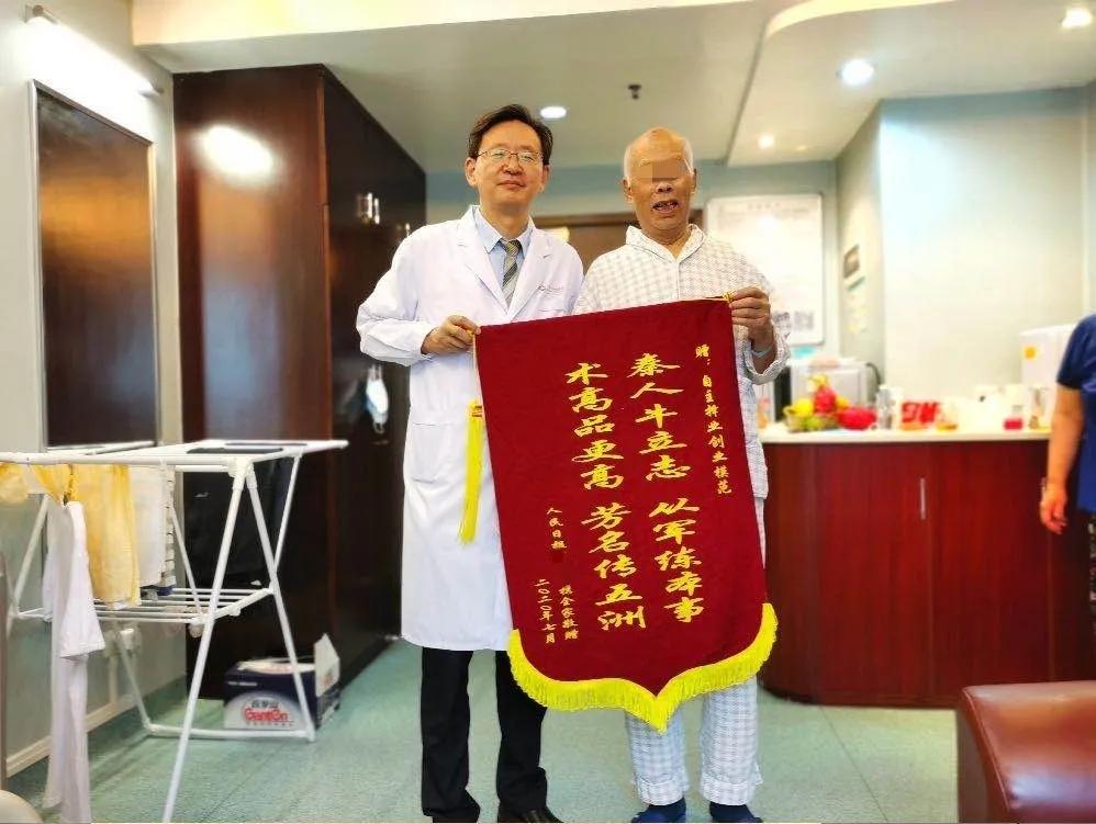 “我印象特别深刻是牛院长第一次会诊就跟我说:‘你放心,我保证给你药到病除。’这句话给我很大的治病信心和动力。”丁老说每一次查房,无论是牛院长、钱伟主任、施娟娟主治医师还是三病区的护士们,都会问长问短,杨秀丽护士长在手术前还专门给予他们心理辅导与鼓励,让他们恐慌的心理得到了安慰。“其实我也不清楚我自己的情况有多严重,但是医护人员的这种关心,让我从心理上得到了治愈。”为了让丁老安心养病,家人与医护人员都未向他提及病情。随着术后身体的恢复,丁老一家人除了给全体医护人员赠送锦旗之外,还单独为牛院长送上印有“秦人牛立志从军练本事 术高品更高芳名传五洲”的锦旗,以表感谢之情。