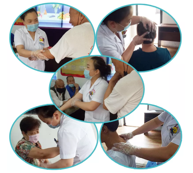 活动现场,阳泉新华医院理疗师一边向居民科普健康知识,一边为老年朋友现场按摩。