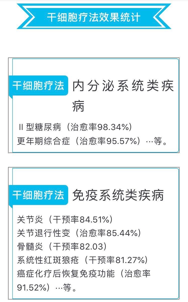 采用干细胞治疗有着多种优势:即使不完全了解疾病发病的确切机理治疗也可达到较好的治疗效果,干细胞疗法是从人体最小单元细胞出发,真正从根本上解决疾病问题,对传统治疗方法疗效较差的疾病多有惊人的效果。