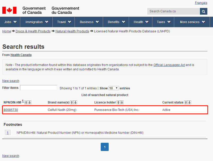 加拿大政府对NPN产品实行严格的“类药品”监管模式,消费者只需到加拿大卫生部官网,输入NPN证书的编号,就可以查询到这个产品的公司名称、品牌信息等资料,公开透明,一目了然,而其中一个增加NAD+水平的抗衰老产品CELFULL NADH则已经通过了NPN认证。