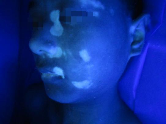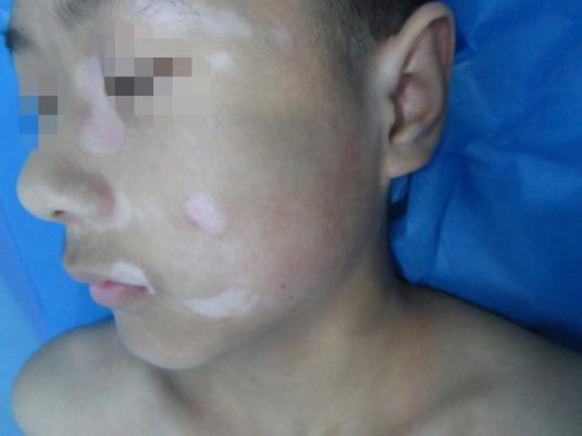 原来一年前,小陈妈妈发现孩子左侧面部出现一个小白点,如米粒般大小,她以为这是癣,于是就没有管它。谁知道随着小陈的长大,这个小白点也在慢慢扩散,相继在脸颊的其他部位新发。
