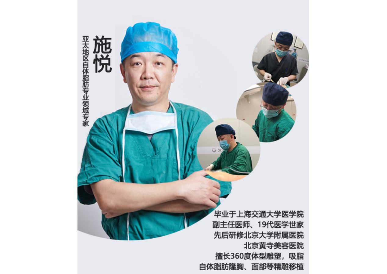 施悦:吸脂填充塑形专家,1992年毕业于上海第二医科大学(现上海交通大学)临床医学专业,20余年整形外科经验,专注自体脂肪移植塑形。19代医学世家,副主任医师。