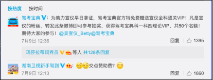 所以在节目后半程的实车训练中,这3个小可怜只能看着另外4个人开车眼馋,并在练习间隙拿出手机刷题,积极准备科目一的补考。就是在准备补考的这段时间,吴宣仪将微博昵称改为了@吴宣仪_betty,于是粉丝玩起了谐音梗“可爱Betty努力背题”。此举更是引来有着“国民驾考神器”之称的驾考宝典的关注,在微博上立即上线助力吴宣仪考驾照的抽奖活动。