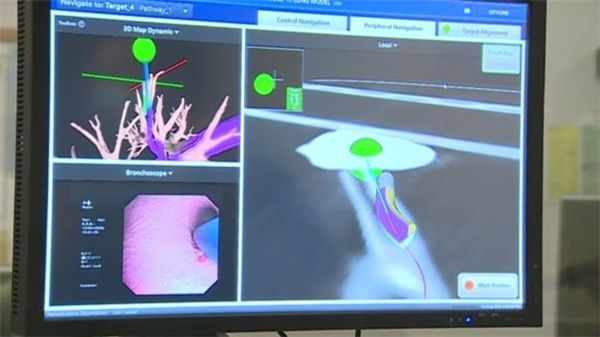 支气管镜检查使用类似GPS技术来创建肺部的3D图像,将以前可能因为太小或位于棘手位置而被遗漏的肿瘤凸显出来。这个3D图像帮助医生引导导管通过肺部最复杂的气道,然后他们可以尽快治疗癌症肿瘤。