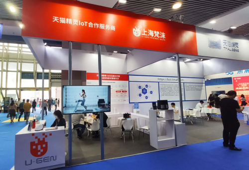 除以上亮点外,天猫精灵loT合作服务商上海梵沫的展台也吸引了不少目光,尤其大屏幕滚动播放的“天猫精灵联合定制款”亿健精灵ELF跑步机视频让很多客商忍不住驻足观看,大家纷纷对“第一台会说话的跑步机”产生了浓厚兴趣。