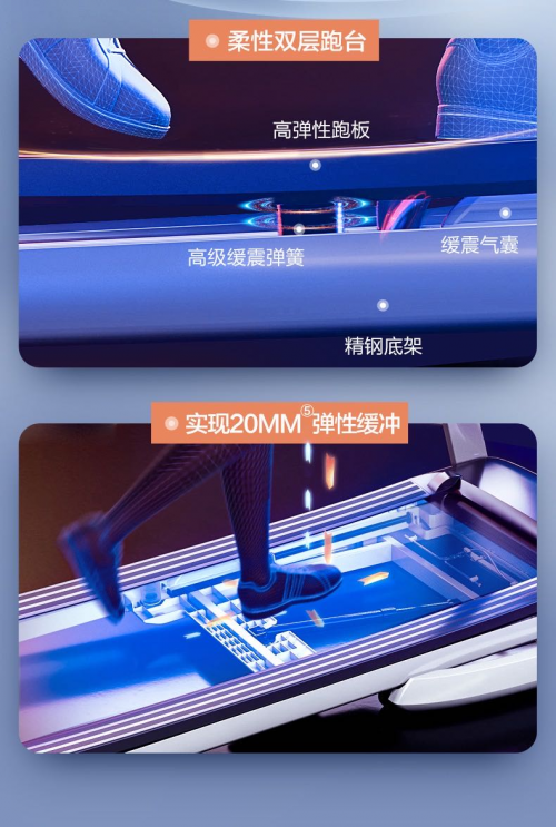 二、其次亿健精灵ELF的减震静音功能十分强大。前面提及到亿健品牌经过十五年的深耕沉淀,累计研发升级了六代减震技术,其中ELF使用的就是第六代AI柔性减震,原理是通过减震气囊、减震弹簧、减震跑板以及底部的底架,四层结构化解跑步冲击力。说的好理解一点就是,在ELF上面跑步跑带会给予缓冲,(非不稳)一弹一弹的,最高回弹会有20mm,比塑胶跑道的回弹还要更明显,一方面可以有效防护膝盖损伤,另一方面能够有效降低噪音,真正满足不打扰家人和邻里的需求。