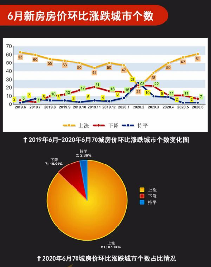 国家统计局7月16日公布6月70个大中城市新建商品住宅销售价格指数,数据显示,70大中城市中有61城新建商品住宅价格环比上涨,近9成新房价格环比上涨,5月为57城;环比看,银川涨幅1.9%领跑,北上广深分别涨0.4%、涨0.5%、涨0.6%、涨0.8%。