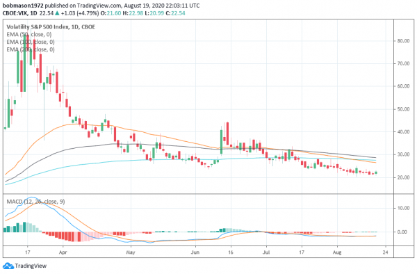 星期三,这是VIX连续第二天处于绿色状态。继周二上涨0.75%之后,VIX上涨4.79%,收于22.54。