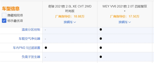综上所述,从防疫功能来看,奇骏有普通的PM2.5空滤,可以保障基本的空气质量,而WEY VV6在这方面可谓诚意满满,中国汽研认证的“CATARC CN95”空调滤芯、等离子空气净化器都是“王炸”。此外,WEY VV6的智能驾辅配置和生命体征监测都较奇骏略高一筹。相信看到这里,大家应该知道真正的安全座驾该如何选了吧?