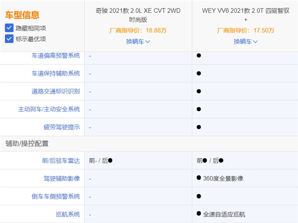 灵魂一问:买车最重要的是什么?或许你会说动力、空间亦或是油耗,不过这些需求都要建立在安全的基础上,如果连安全都得不到保障,一切便是空谈。然而很多人对于汽车安全性并不了解,在选择时难免摸不着头脑,为此我特地选出市面上两款同等价位的车型,分别是WEY VV6(2021款 2.0T 四驱智驭+/17.5万)和日产奇骏(2021款 2.0L XE CVT 2WD时尚版/18.88万),希望对比过后,能在选车时对你有所启发。