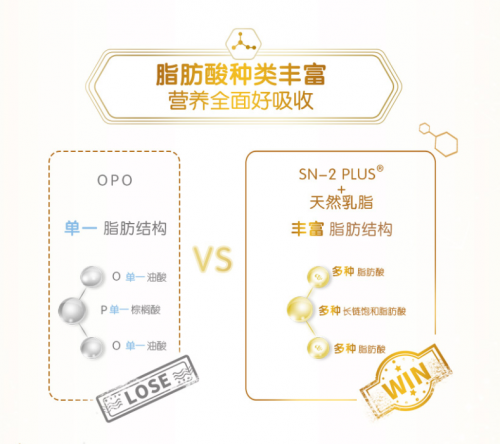sn-2 plus搭配25%的天然乳脂是一种具有独特脂肪结构的结构脂技术,是目前被公认为婴儿配方奶粉脂肪类产品发展的一款具突破性的产品,对婴幼儿的生长发育有促进作用。这种技术使脂肪成分更容易被人体消化吸收,从而能够为每位宝宝提供充足的能量供应。在配方奶粉中添加这种成分能优化脂肪结构减少钙皂形成,避免宝宝的便便变硬,减少便秘上火发生的可能性。对比OPO结构脂来说,sn-2 plus搭配25%的天然乳脂有着更多的OPO含量,无忧喂养营养好吸收。