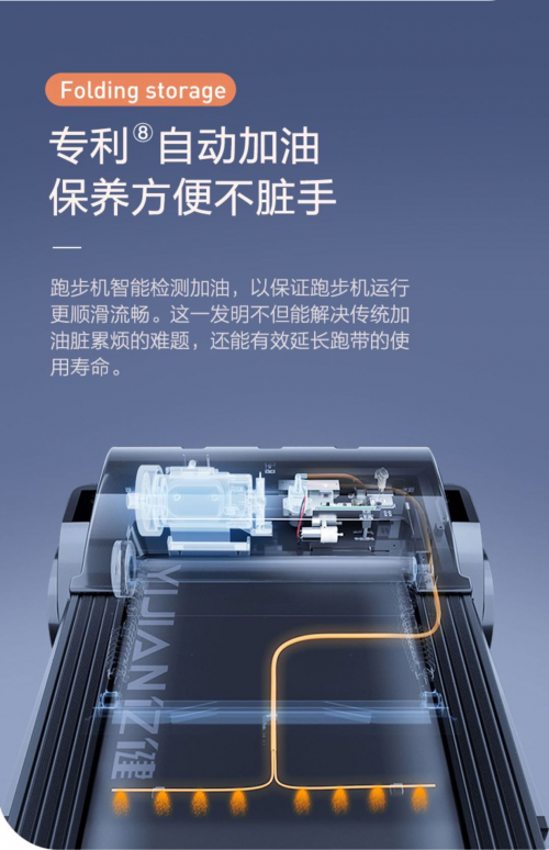 自动加油技术也是亿健独家专利,相比较市面上宣传的自助加油,(其实也就是手动加油))亿健的加油技术可谓真正贴心,让所有亿健跑步机都能实现智能保养。这一技术简单说就是跑步机运行约5公里后可以智能检测加油,起到自动养护的功能,从而保证运行更顺滑流畅,延长跑带的使用寿命,不仅轻松方便,而且大大降低了用户因为手动加油需掀开跑带可能带来的意外伤害。