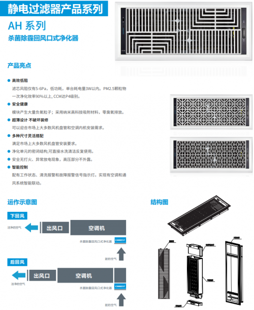 回风口式商用空气净化器,利用静电净化技术,对流经净化器的空气进行除尘、杀菌处理,适用于全回风或部分回风的中央空调系统或通风系统的区域回风段,广泛用于商场、楼宇、酒店、医院、写字楼、学校等场所。