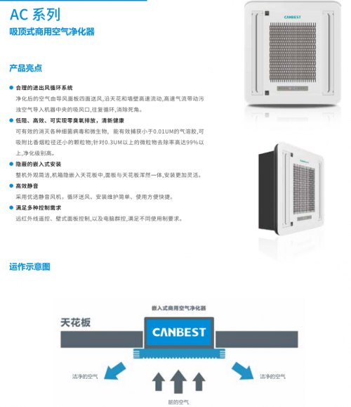 吸顶式商用空气净化器,采用高效静电净化技术,PM2.5去除效率高达99%,可彻底清除室内各种烟雾、灰尘、花粉、细菌和病毒;可以直接安装于吊顶空间内,自带风机,对室内空气进行全面循环净化,广泛适用于机场、高铁站、酒店、写字楼、会所、图书馆、学校、培训中心等场所。
