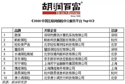 胡润百富《2020中国互联网保险中介服务平台Top10》发布 微保、蚂蚁保险、轻松保严选列前三