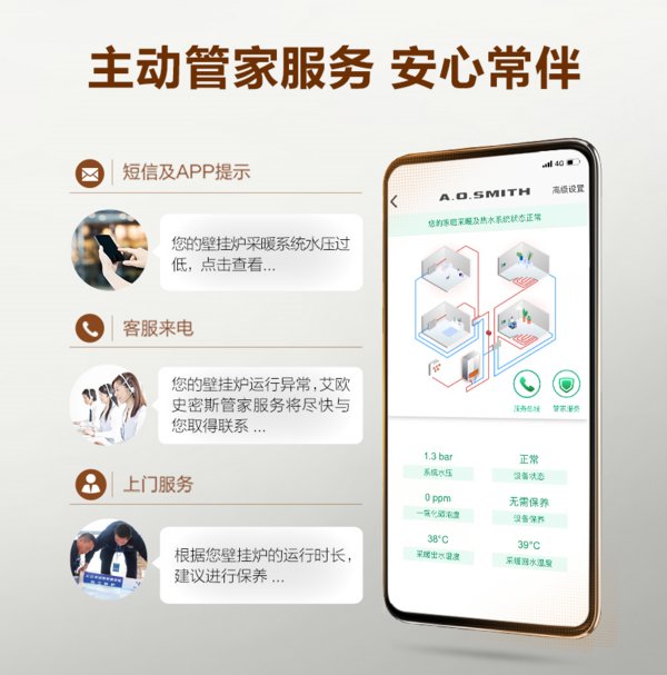 这款产品搭载IOT物联网技术,通过“AI家智控APP”为用户提供专属智能管家主动服务,对采暖系统进行7*24小时全天候长效监控保护,智能管家会主动提前告知用户采暖炉保养等讯息,并提供私人一对一的贴心引导,从专业客服咨询、电话视讯指导到上门维修服务,层层分解,耐心可靠,真正做到随时待命、主动服务,令用户无需等待、独享1级安心。