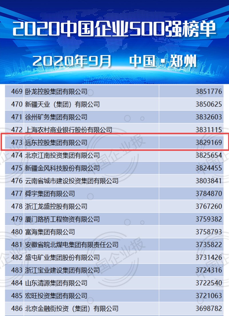 峰会上,2020中国企业500强榜单揭晓,远东控股集团有限公司再次上榜,位列第473位,同时位列中国制造业企业500强榜单第224位。这是远东控股集团第14年入围中国企业500强。据悉,今年中国企业500强、中国制造业500强入围门槛继续提高,分别为359.6亿元、100.7亿元,比去年分别提高36.4亿元、12.1亿元。