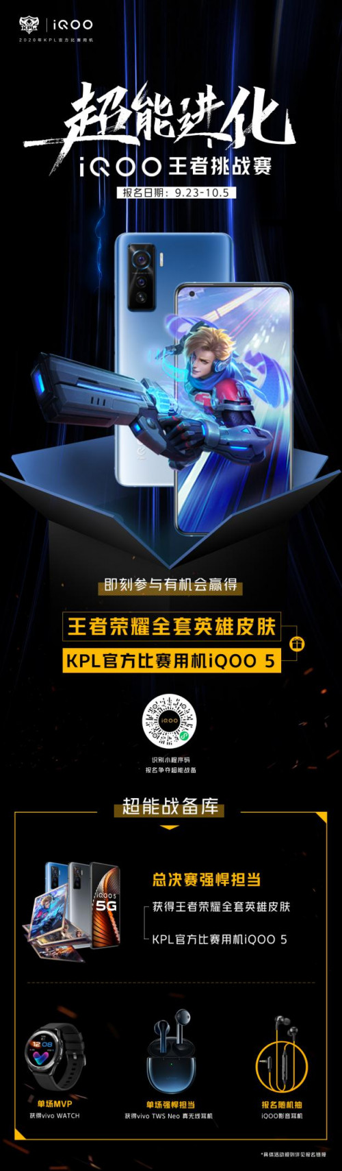 2020年9月23日,iQOO社区正式开启“超能进化 iQOO王者挑战赛”活动,选拔王者荣耀各分路5名强悍玩家,与KPL明星选手面对面,进行集训指导并组团对战专业战队,赢取丰厚礼品。