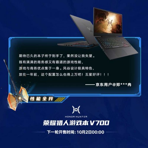 荣耀猎人游戏本V700是非常出色的一款游戏本,万元内的价格与它的实力“不成正比”,所以它的性价比极高,值得入手。荣耀猎人游戏本V700第二轮预约已经开始,将于10月2日开售,喜欢的朋友抓紧机会抢购。