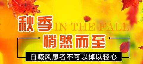 秋季气候变化明显,天气忽冷忽热。患者还要注意适时添加衣物,加强体育锻炼,增强身体抗病能力,避免免疫力下降诱发、加重白癜风。秋季外出游玩时,要做好外露皮肤的保护工作,做好防晒准备,尽量保护好自己,避免擦伤、碰伤发生。