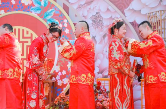 一人进远东,全家远东人,在一片祝福声中,新人们一拜天赐良缘,二拜福寿安康,三拜子孙满堂……新颖而充满仪式感的集体婚礼有序进行,新人行结发礼,饮合卺酒,为美满爱情留下永恒印记。