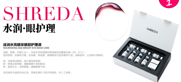 诠润全新推出的SHRED诠润水亮睛采眼部护理液Nourishing And Bright Eye Wash Care,富含透明质酸+双重维生素,水、甘油、氰钴胺(维生素B12)、吡哆素(维生素B6)、透明质酸钠。能使保持眼睛清亮、舒缓的效果,并能护眼养眼。