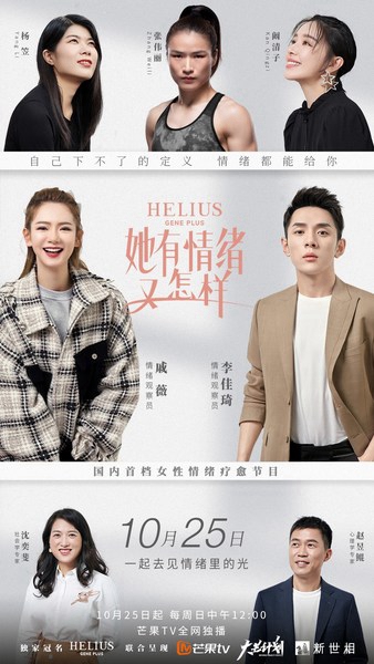秉承着对女性情绪自由的关爱,HELIUS赫丽尔斯独家冠名的国内首档针对女性情绪疗愈类栏目《她有情绪又怎样》,特邀请实力演员戚薇作为情绪辅导员,时尚主播李佳琦作为情绪倾听者,复旦大学社会学系副教授、社会学专家沈奕斐和清华大学积极心理学研究中心副主任赵昱鲲作为情绪观察方面的专家,通过观察青年演员阚清子、脱口秀演员杨笠以及亚洲首位UFC冠军张伟丽,这三位女性与情绪相处的经历,为情绪正名,用爱与关怀传递自信的能量。希望每一位女性都能突破社会对情绪的偏见,学会与自己与情绪相处,实现“情绪自由”、达到“悦己”的生活状态。
