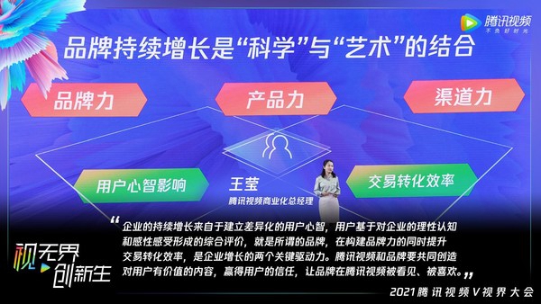 面对市场环境的不断变化,腾讯视频的营销能力也在持续进化。腾讯视频商业化总经理王莹认为,企业的持续增长来自于建立差异化的用户心智,用户基于对企业的理性认知和感性感受形成的综合评价,就是所谓的品牌,在构建品牌力的同时提升交易转化效率,是企业增长的两个关键驱动力。腾讯视频和品牌要共同创造对用户有价值的内容,赢得用户的信任,让品牌在腾讯视频被看见、被喜欢。