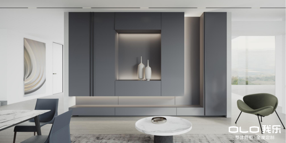 以我乐家居莫兰迪系列全屋定制为例,该系列以经典的高级灰色调为主体,再赋予50°雾感灰的婴儿般肌肤质感,让空间呈现出了高端又柔和的气质。