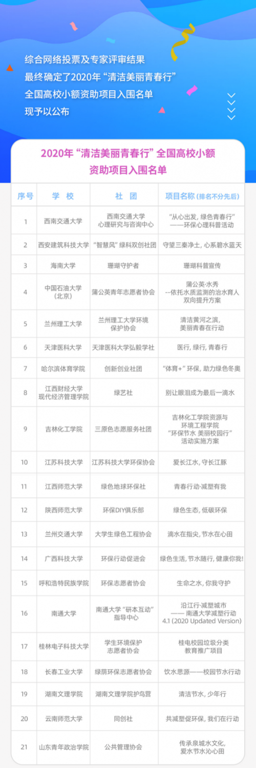2020花王“清洁美丽青春行”全国高校小额资助项目入围名单揭晓