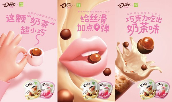 德芙天猫美食超级CP日新品“嚼着吃的小颗奶茶“,Q弹软心,多重味蕾享受。包装色彩搭配得可爱又清新,瞬间抓住眼球,非常契合年轻人的高颜值追求。小小一颗既能尝到奶茶的醇香,又能感受到巧克力的丝滑。