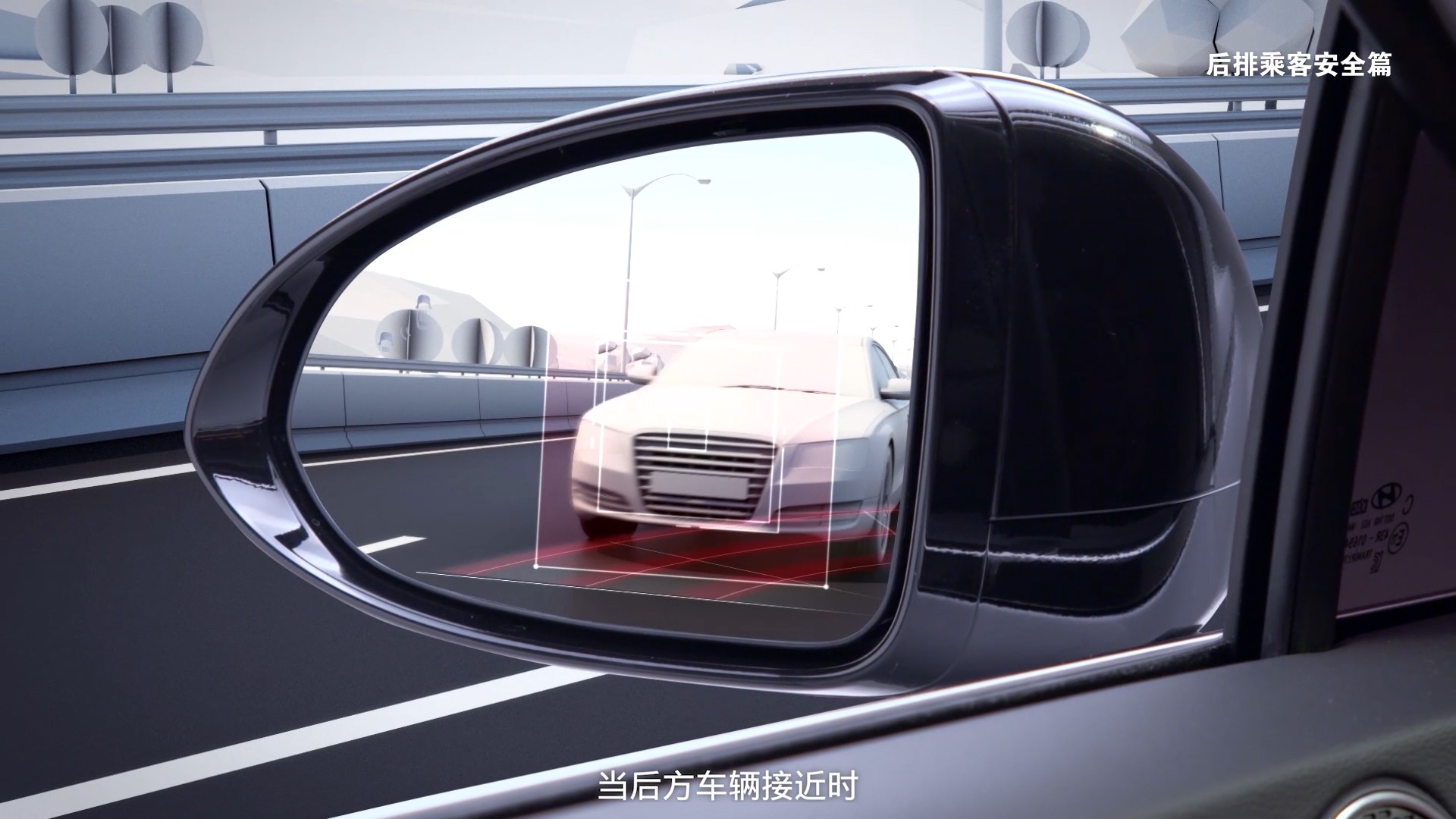 在日常使用当中,系统将通过车后方的盲点雷达监测后方来车情况。当后方车辆接近时,相应后视镜上会进行提示,且仪表盘会显示“请注意安全”的提示语,车门将自动锁闭,并发出报警。