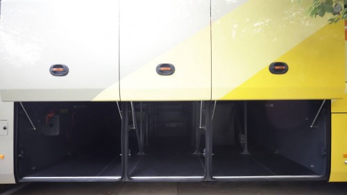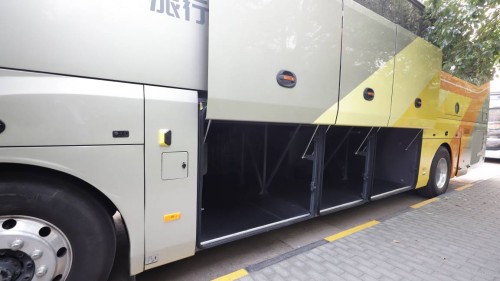 行李舱开关门的形式和我们常见的有些不同,常见的大巴车上都是气动开关门,而旅行家则采用了电动平移行李舱门。取消了气动装置、减轻了车门的重量,车门还带有电吸功能,关门后行李舱部位更加平整,密封性也大有提高。