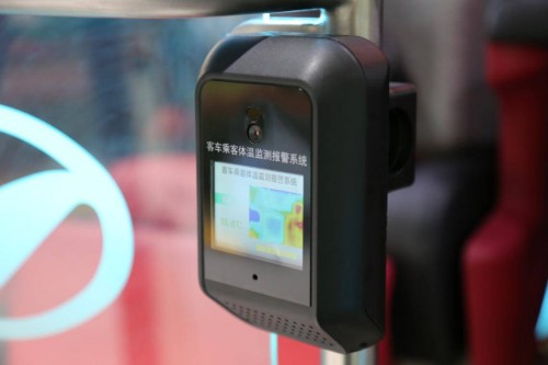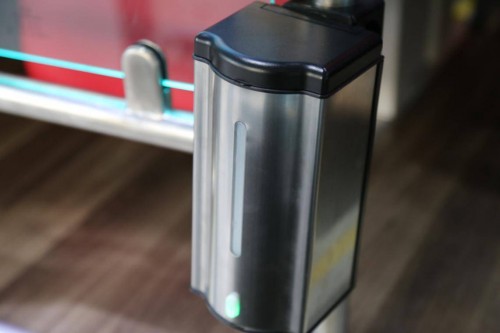 当我们进入车厢内部的时候可以看到有两组设备,第一组的体温检测报警系统。还有一组就是带有红外感应的自动洗手消毒机,这两项配置应该是防疫常态化的装备。