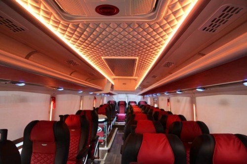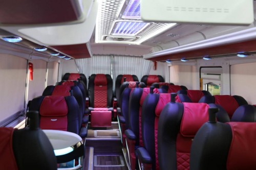 车厢内部采用了右1左2的座椅布置形式,所有座椅均采用了酒红与雅黑双拼的高端软座。座椅左右两边均设置了扶手,前部还设置了脚托,可以根据乘客的需求来进行角度调节。